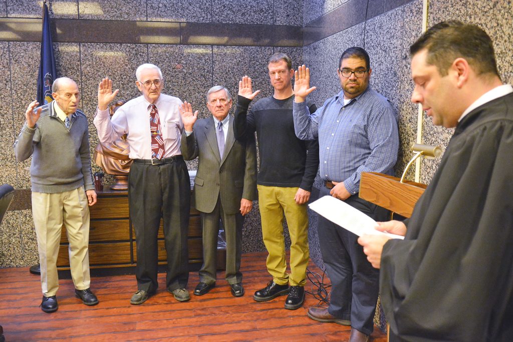 Fayette County Court of Common Pleas Judge Joseph George Jr. administered the oath of office to new Mayor Bernie Kasievich, newly re-elected Councilmen Phil Michael and Blair Jones, and re-elected Treasurer Joseph Giachetti and re-elected Controller James Sileo.