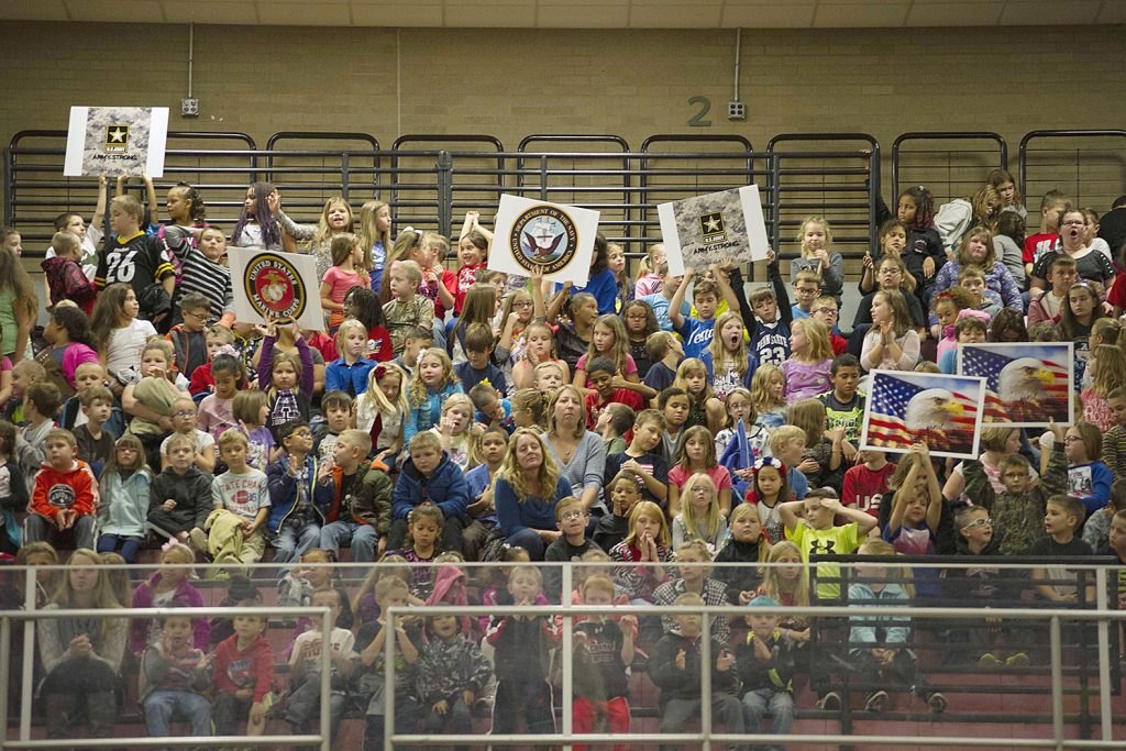 In the high school gym, students waved placards with the emblems of the armed services. The high school band played the United States Military Armed Forces Medley as veterans present stood while their branch of the service was honored.