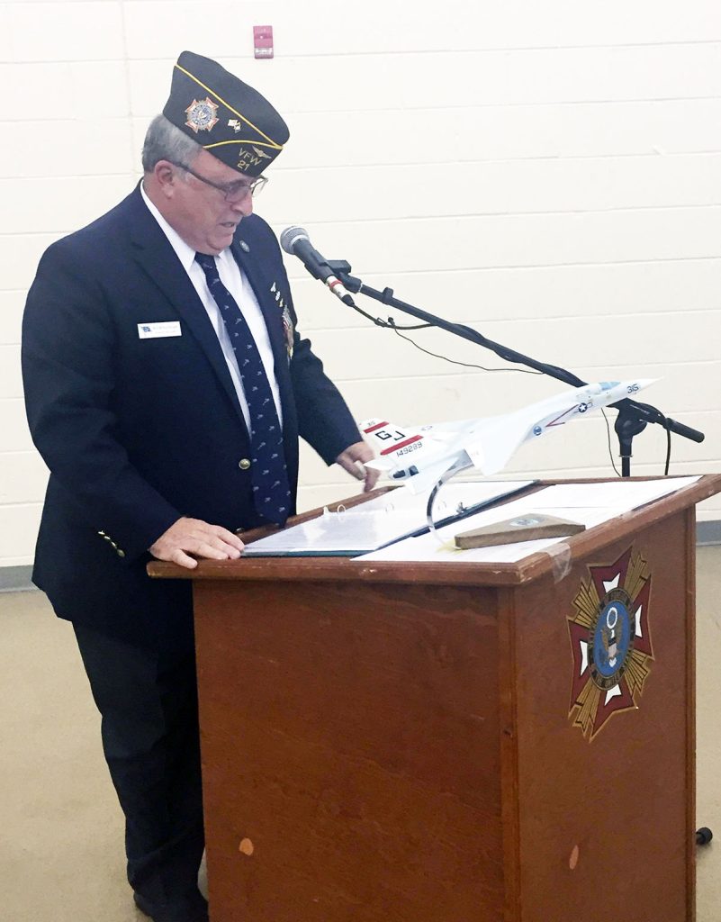 Retired Master Chief Ronald Shroyer took to the podium at the National Guard Readiness Center as the keynote speaker for the recent annual veterans luncheon hosted by the CAHS Patriots organization in Connellsville.