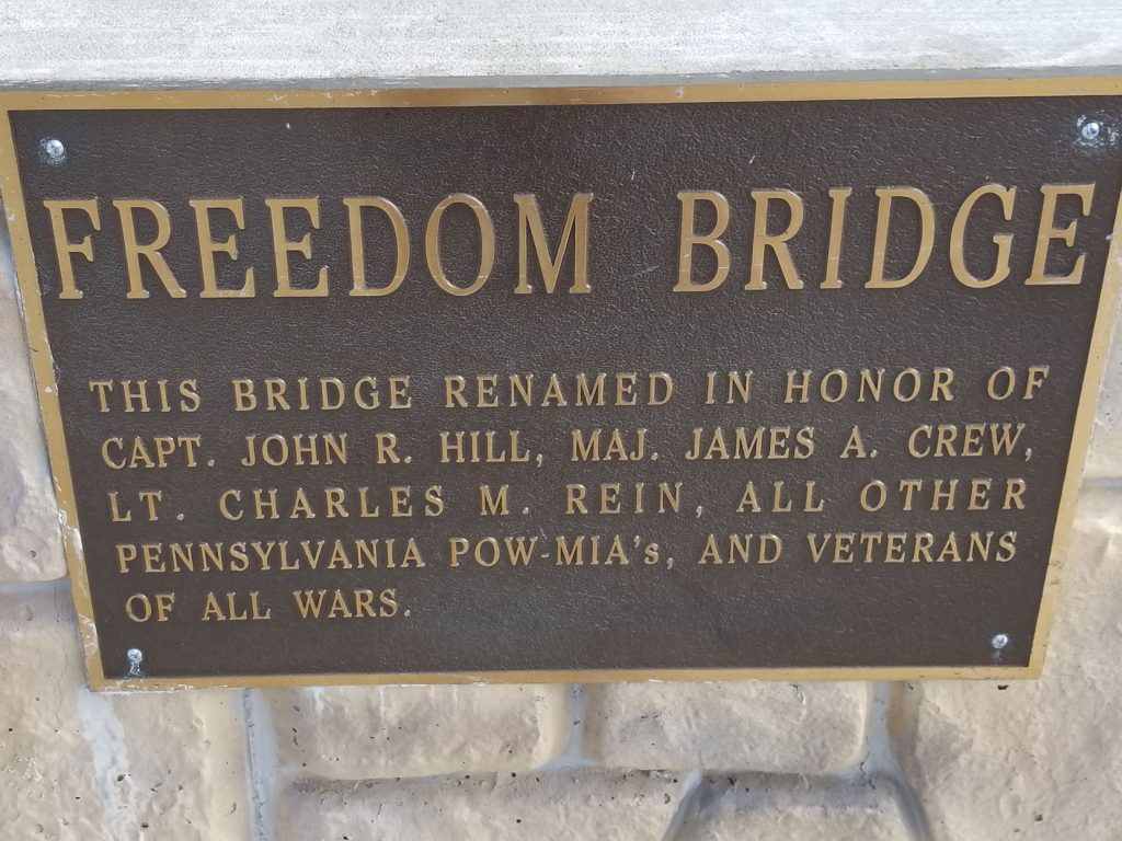 Freedom Bridge is named in honor of local veterans Capt. John C. Hill, Maj. James A. Crew, Lt. Charles M. Rein and all other Pennsylvania POW-MIA’s and veterans of all wars. Snyder recognized them, stating that “everyone here is so proud to see the bridge named in their honor and in honor of all veterans. We wouldn’t be here today without their service.”