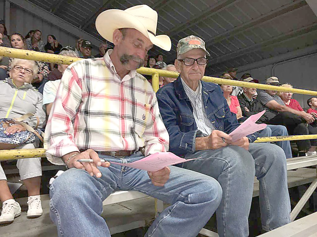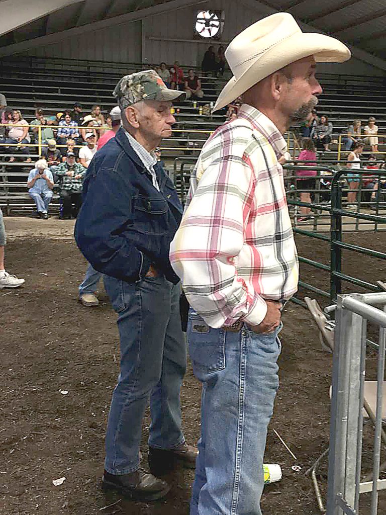 Randy Breakiron, left, sits with his father, Wendell Breakiron, both of Hopwood, in the Indoor Arena during 4-H Market Swine competition at the Fayette County Fair. Toni Marie DeCarlo, of New Salem, who is Wendell's granddaughter and Randy's niece, was participating in the competition and is completing her final year of 4-H. Altogether, the Breakiron family has participated in 4-H livestock shows at the fair for 52 consecutive years. Randy said, “Dad was always there and that’s why he’s here tonight.''