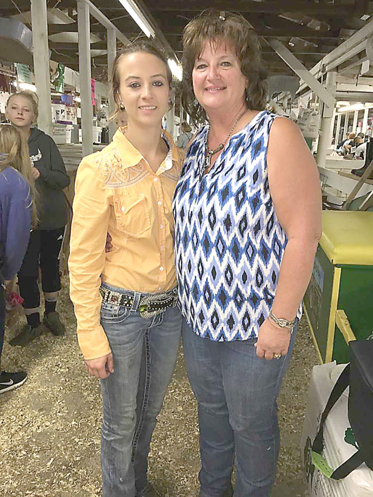 Toni Marie DeCarlo, and her mother, Charlotte DeCarlo, of New Salem, pose for a photo in the barn during Toni Marie's final 4-H market swine competition at the Fayette County Fair. Toni Marie, who also shows a market steer, is completing 4-H this year, finishing a 52 consecutive years of participating in 4-H livestock shows for the Breakiron family.