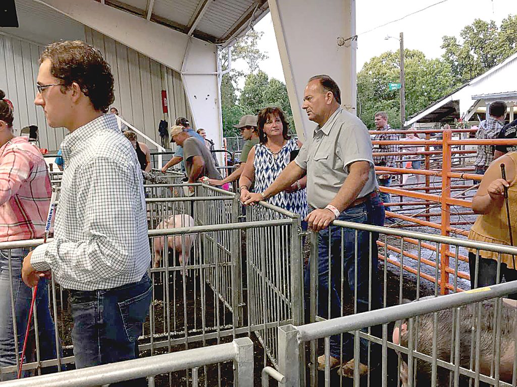 Charlotte and Tony DeCarlo, center, of New Salem wait to watch their daughter, Toni Marie, compete in showmanship during the 4-H market swine show at the Fayette County Fair. Toni Marie is completing 4-H, ending 52 consecutive years of 4-H livestock shows for the Breakiron family. Charlotte's father Wendell Breakiron, of Hopwood, started his four children in 4-H in 1966 and four grandchildren followed. Charlotte said, "It's something to be proud of.''