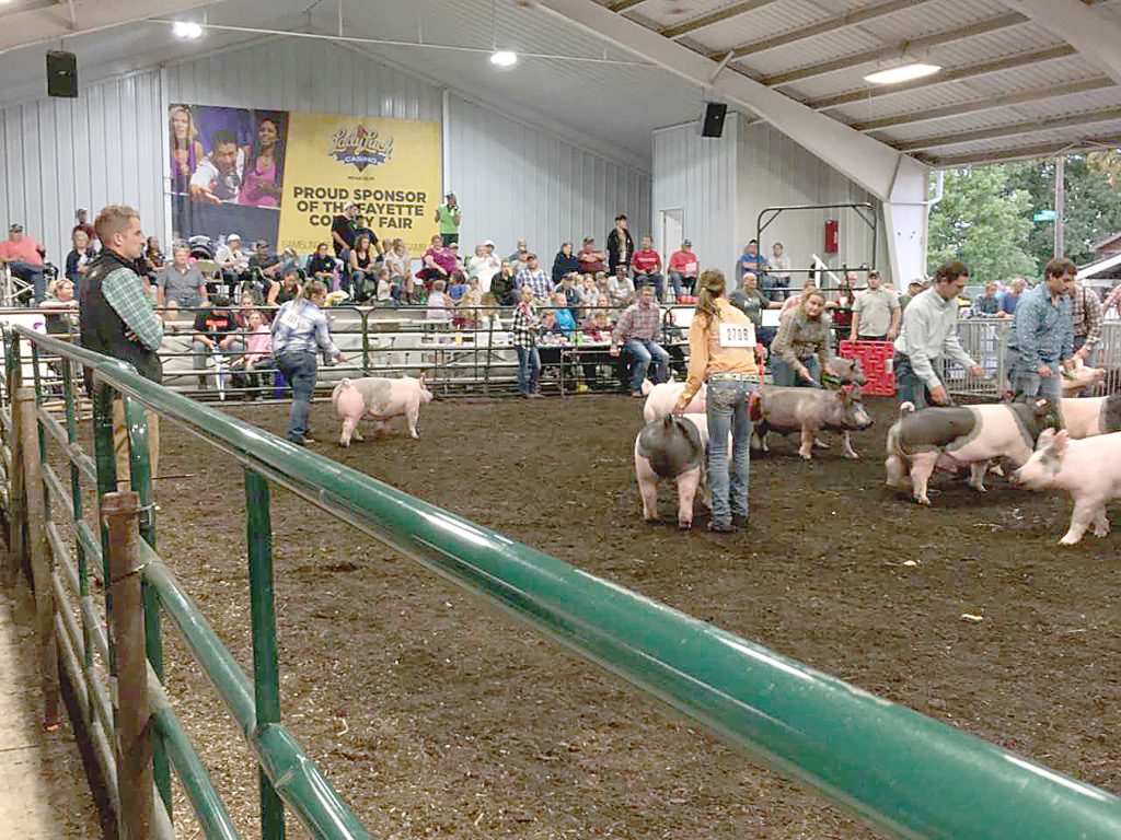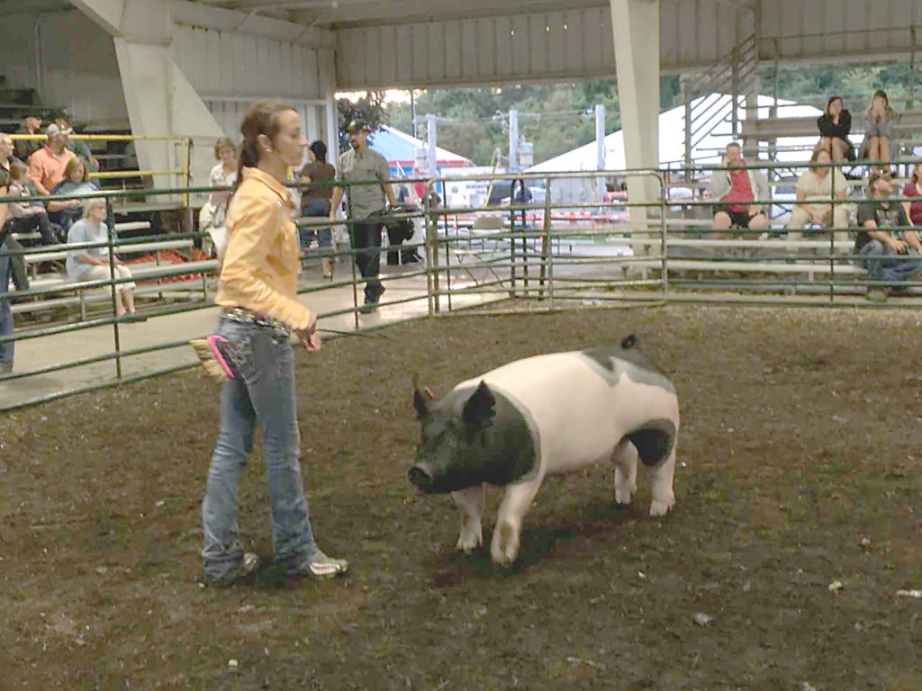 Toni Marie DeCarlo, of New Salem, participates in showmanship competition during the 4-H market swine show at the Fayette County Fair. Toni Marie is completing 4-H, ending 52 years of 4-H livestock shows for the Breakiron family. Her grandfather Wendell Breakiron, of Hopwood, started his four children in 4-H in 1966 and four grandchildren followed. Toni Marie also showed a 4-H market steer and is participating in the 4-H Livestock Auction.