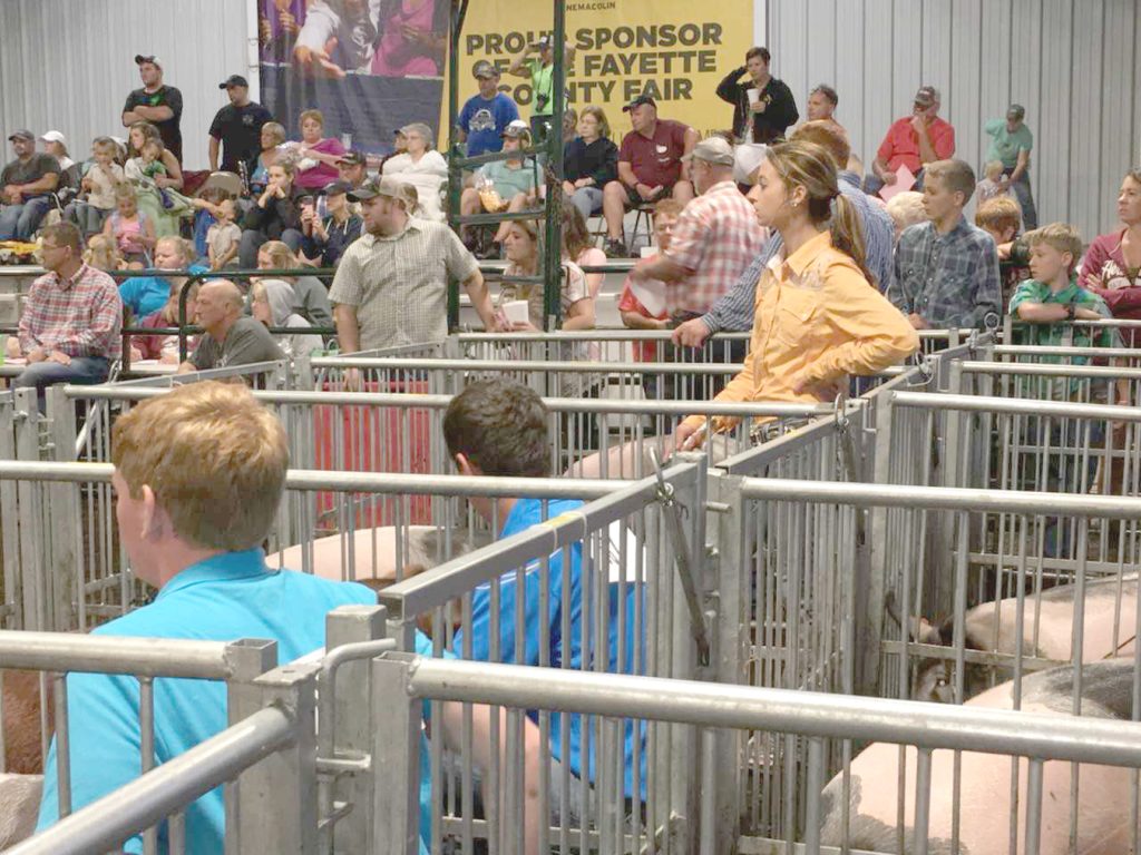 Toni Marie DeCarlo, of New Salem, in yellow shirt, waits to participate in showmanship competition during the 4-H market swine show at the Fayette County Fair. Toni Marie is completing 4-H, ending 52 years of 4-H livestock shows for the Breakiron family. Her grandfather Wendell Breakiron, of Hopwood, started his four children in 4-H in 1966 and four grandchildren followed. Toni Marie also showed a 4-H market steer and is participating in the 4-H Livestock Auction. “It’s good – the memories and the friends,’’ Toni Marie said of 4-H.
