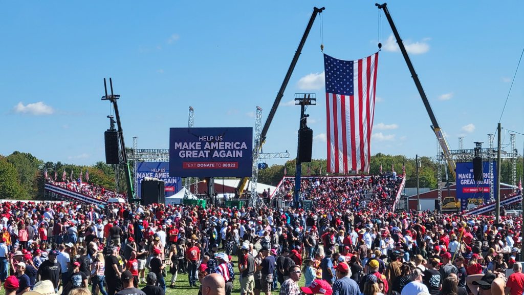 The rally took on an especially patriotic theme with a huge American flag – the same one from the previous rally that was twisted over in a way following the assassination attempt that many of Trump’s supporters thought it resembled an angel – once again hung behind the stage.