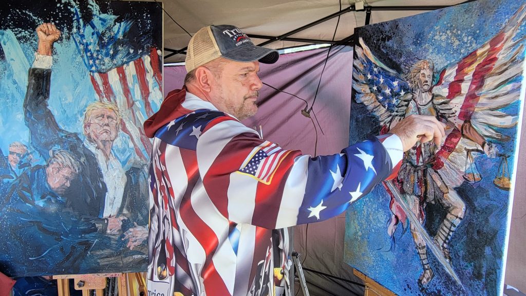 Supporters who attended said they had various reasons to attend Saturday’s rally, including Mark Henry of Latrobe, who said the attempted assassination inspired him to paint again. Henry, who stood under a tent within view of the stage while painting a patriotic image of St. Michael the Archangel, said he hadn’t painted in 35 years until he replicated the now iconic image of Trump pumping his fist in victory.