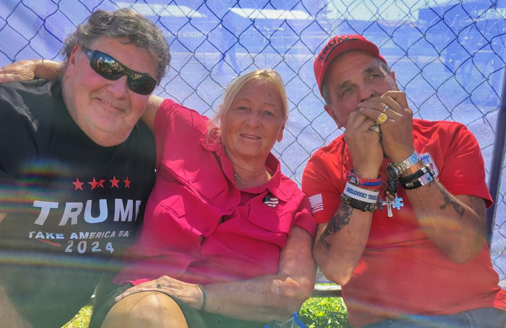 Frankie “Da Fridge” Somma drove overnight six hours from his home in East Stroudsburg in northeastern Pennsylvania and made fast friends with Rock and Barb Testa of West Deer. Somma entertained himself by playing his harmonica while grabbing a shady seat with the Testas by a fence with fabric announcing the words “Fight! Fight! Fight!” that Trump shouted to the crowd on that fateful day after being escorted off the stage with blood streaming down his cheek.
