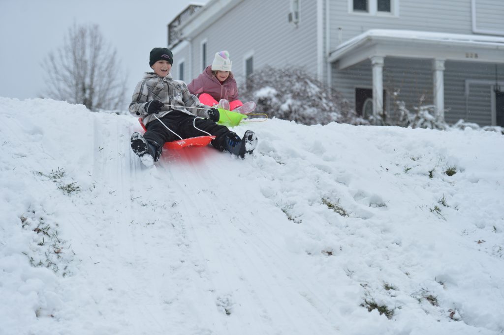 Kaitlyn Wildermuth of Bayville, N.J., took advantage of her day off from classes at Washington & Jefferson College to slide down the snowy hillside in front of Old Main with a trash bag she fashioned into a makeshift sled. The sophomore communications major said she was surprised no other students were out playing in the winter wonderland.
