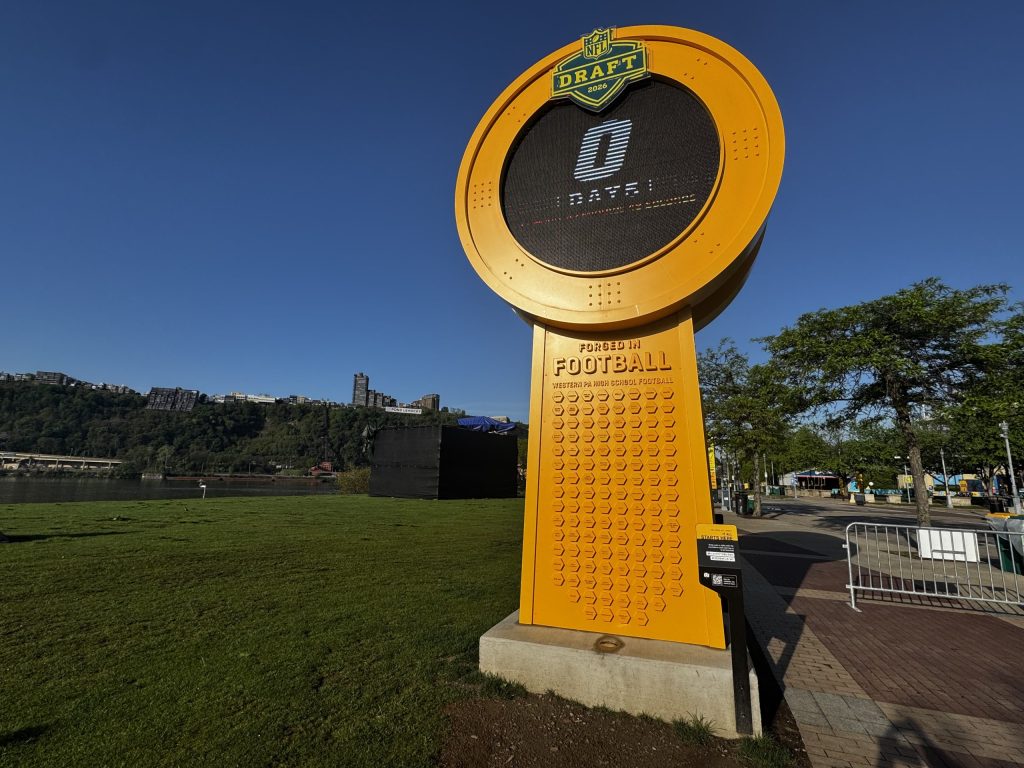 The countdown clock welcomes visitors to the 2026 NFL Draft in Pittsburgh. [Karen Mansfield]