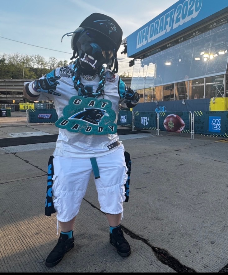 Deejay "Cat Daddy" Howell drove from Charlotte, N.C., with his son – who was still sleeping when this early morning photo was taken – to witness the NFL Draft. Howell said he makes the trip to all the Pitt Panthers' football games. [Karen Mansfield]
