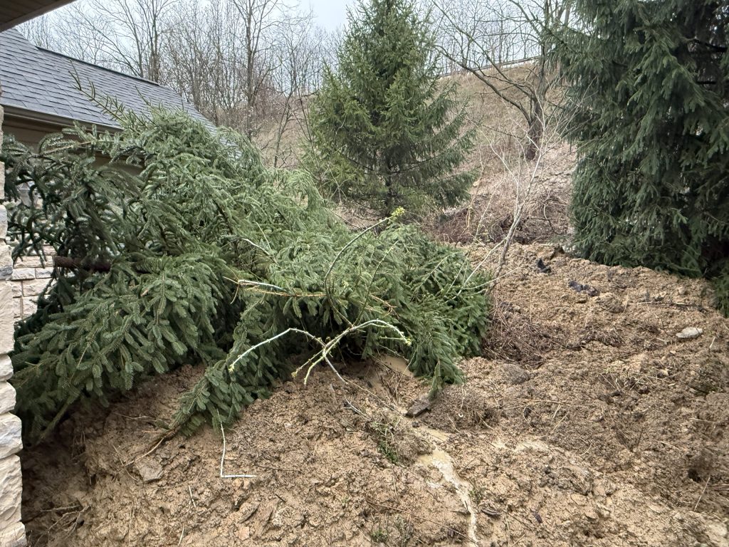 “Several days ago we had a small mud slide up from the top of the hill, and I had our landscaping company, Mow, Mulch and More, come in,” Kashery said. “They were cleaning up the mud … Had them dump some gravel up there to try to prevent this big slide, and they were going to drive some steel beams in and try to prevent this hill from sliding anymore. Last night it got too bad, and it just took out everything.”