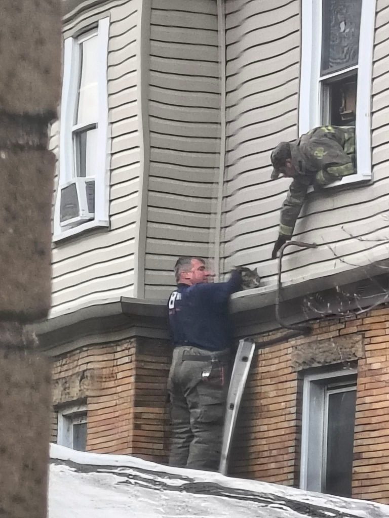Firefighters returned to the building later Tuesday morning to rescue a cat on a third-story ledge.
