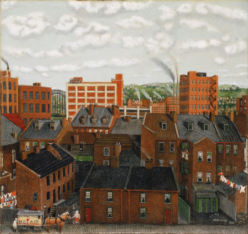 Many of those paintings are now in the hands of museums and private collectors, and the Senator John Heinz History Center in Pittsburgh has assembled 37 of them for its exhibit, “Pittsburgh’s John Kane: The Life and Art of an American Workman,” which opened last month and will be there through Sunday, Jan. 8, 2023. The paintings come from such institutions as the Metropolitan Museum of Art, the Smithsonian’s Hirshhorn Museum and Sculpture Garden and the Detroit Institute of Arts. According to Andy Masich, president and CEO of the Heinz History Center, “Pittsburgh’s John Kane: The Life and Art of an American Workman” isn’t just a showcase of the artist’s oeuvre but a window into life in Pittsburgh when it was at its grittiest and, arguably, its most dangerous.
