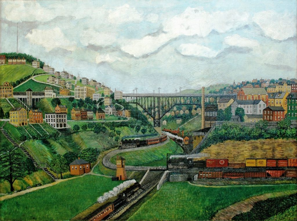 Without any kind of formal training, Kane started sketching in landscapes on the side of railroad cars while drawing a paycheck from the Pressed Steel Car Company in McKees Rocks. His focus was primarily on his surroundings and memories of his early life in Scotland. Before he died, Kane’s work received a measure of recognition. One of his paintings found its way into the Carnegie Museum of Art’s exhibit of contemporary art, the Carnegie International, in 1927, and the tale of the unschooled, aged laborer and his paintings gained traction nationally. Within a couple of years, his primitive and colorful works were the subject of a show in New York.