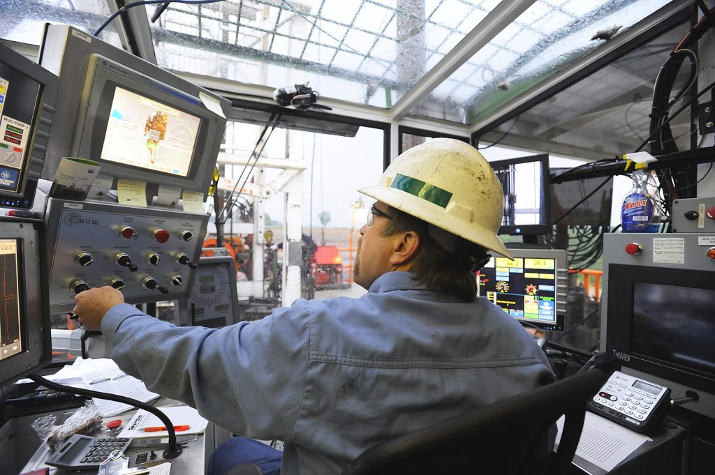 A hydraulic catwalk machine lifts and carries the pipe to the well head. Two men working outside on a 24-foot-high platform nudge the machinery that screws the new sections of pipe to the string. The platform is right outside of the window of an enclosed, climate-controlled cabin where the drill operator runs and oversees the operation using six computer monitors, control panels, a keyboard and a phone.
