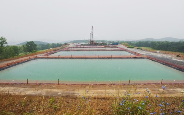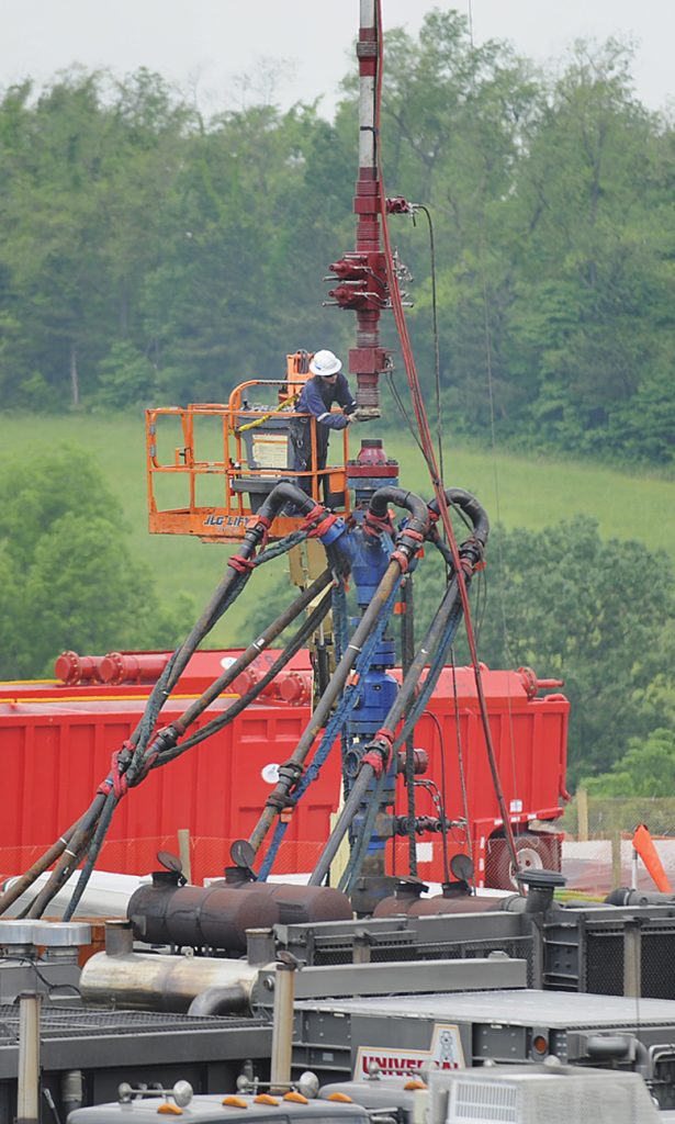 From five well heads just 15 feet apart in the center of 20 acres of a hilltop that was leveled to form a pad at the Greene County farm, Chevron and Crown Drilling, an outfit partially owned by the energy company, drilled five holes 4,000 feet deep and 8,500 feet horizontally in different directions.