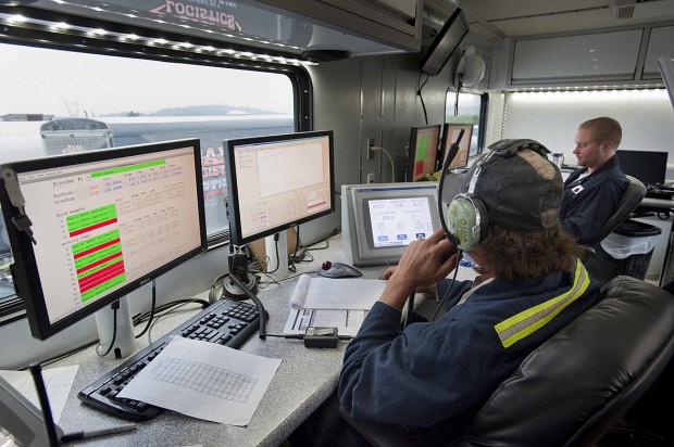 The motors and pumps are wired together and to a control trailer were workers monitor the pressure at the well head, pump rate and the amounts of sand and water being used. Those readings are transmitted in real time to computers in the company’s Marcellus division office in Moon Township where engineers monitor the process, Hild said.