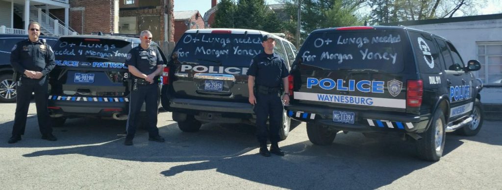 Signs with O+ Lungs Needed for Morgan Yoney are appearing throughout Greene County and elsewhere, including on the rear windows of three Waynesburg Borough police vehicles.