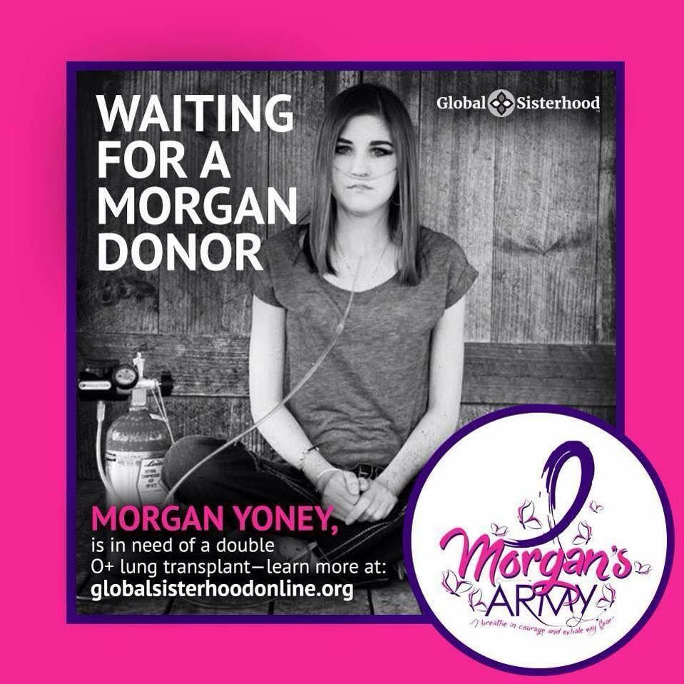 “We are on the ‘Hunt for Lungs’ and it is a race against time to hunt down a set of O+ Lungs for … Morgan Yoney … who is awaiting her second double lung transplant. It has been 600 days since she has been put on the transplant list and she is in dire need of O+ lungs to survive! Her lung function is at 19 percent and dropping. If you know anyone with a connection, please encourage them to make a direct donation by contacting Morgan’s Army on Facebook.
