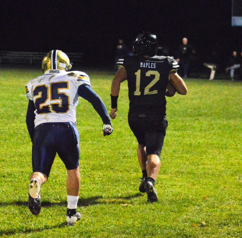 The Bulldogs pushed the margin back out to two scores when Santino Revi intercepted a Mapletown pass and then, two plays later, hauled in a halfback option pass from Whipkey for a 34-yard touchdown. Veatch ran in the two-point conversion for a 22-6 advantage.