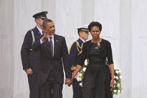 President Barack Obama and first lady Michelle Obama laid a wreath at the marble wall of names and walked to the common headstone of the Flight 93 victims after arriving from the New York 9/11 ceremonies.