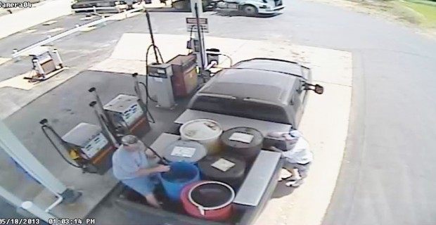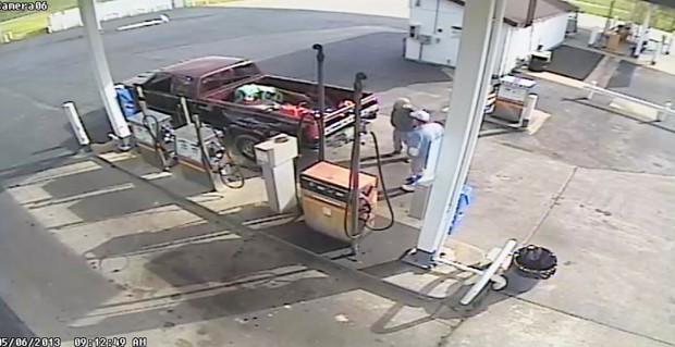 In one surveillance image the suspects are captured filling large containers in the bed of a pickup truck with fuel. In several pictures, the suspects are seen refueling pickup trucks, and in other photos the suspects are seen refueling a two-door silver sedan.