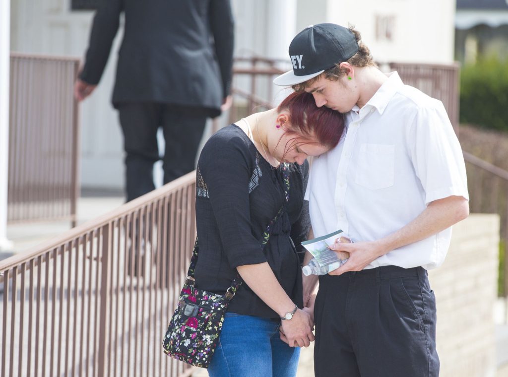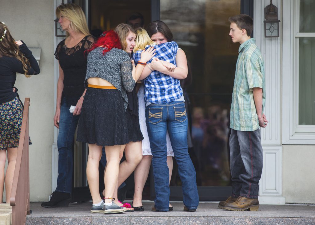 Five teens fell into each other after the service, each simultaneously collapsing and supporting the others.