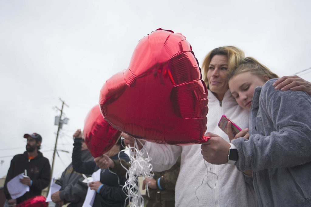 About 30 people gathered behind the shop Thursday evening. Heart-shaped balloons drifted into the clouds while they sang “Amazing Grace.” Cathleen read a poem she wrote, called “Justice for Drew.”