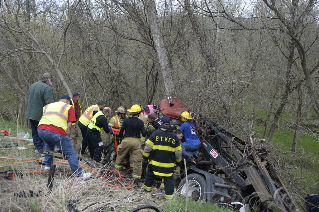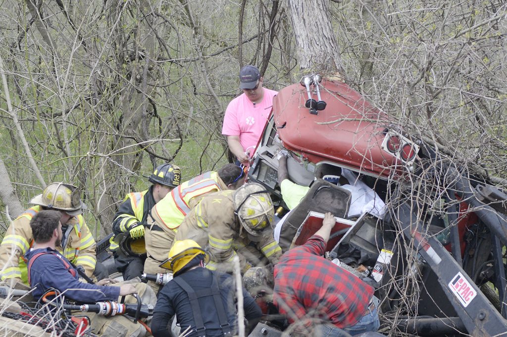 Volunteer firefighters worked for more than an hour to free Marvin Mills, 61, of Vanderbilt from a Fayette Waste LLC. truck which hit a tree down a hillside along Route 51 in Franklin Township at about 1 p.m. Friday while a Fayette EMS medic monitored his vitals.