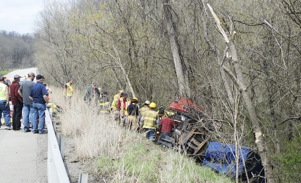 STAT MedEvac and Fayette EMS prepare Marvin Mills, 61, of Vanderbilt for a medical helicopter flight to Pittsburgh after the garbage truck he was driving careened down a hillside along Route 51 Friday afternoon.