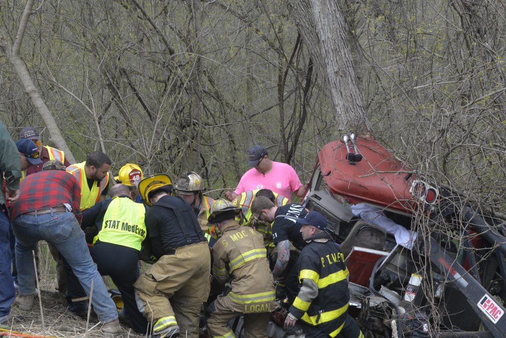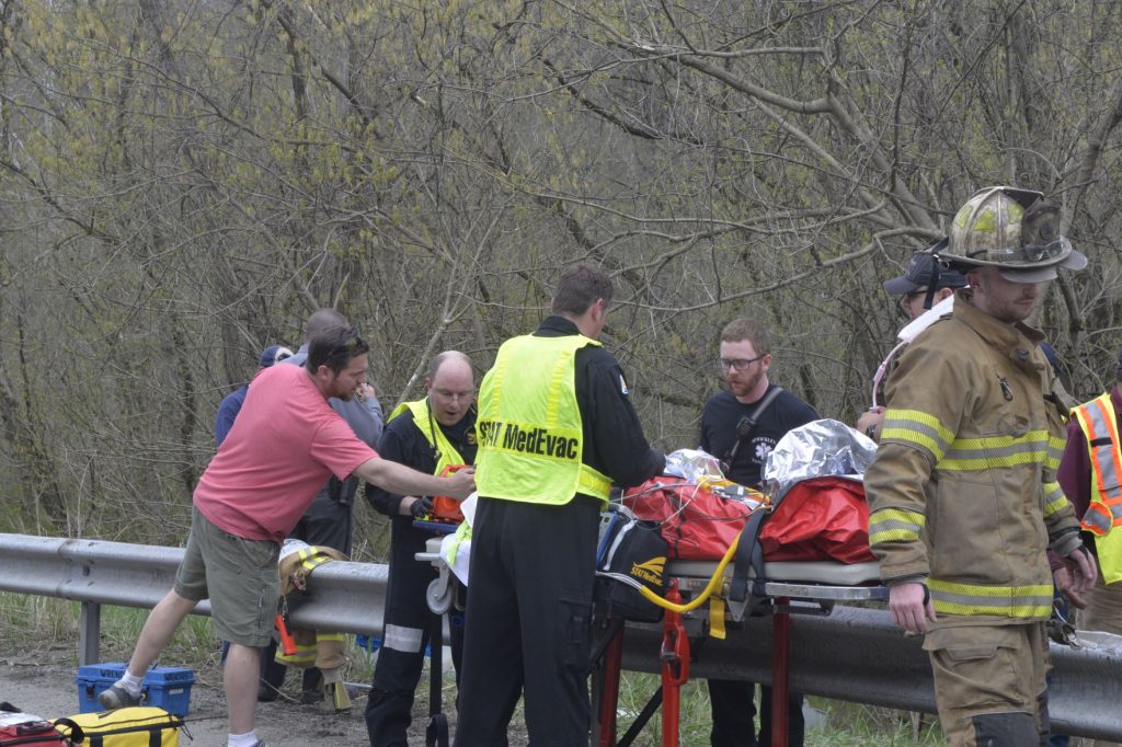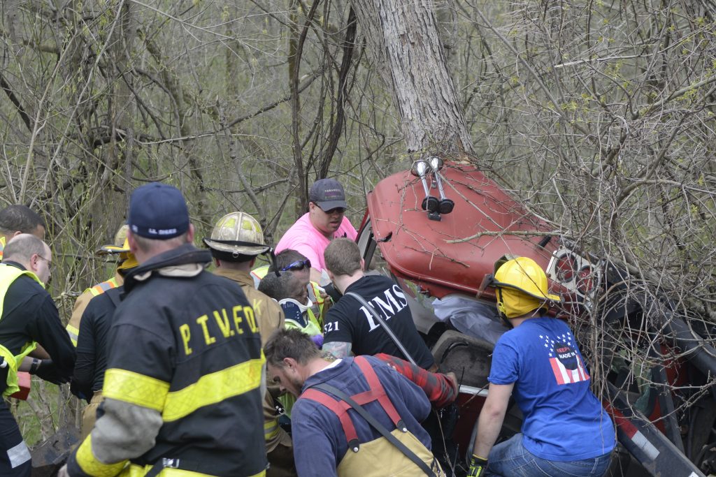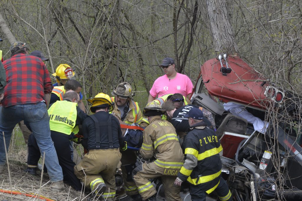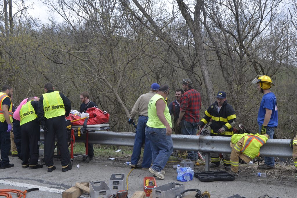 A team of first responders lifts Marvin Mills, 61, of Vanderbilt up a hill along Route 51 after working to free him from a wreck for more than an hour Friday afternoon.