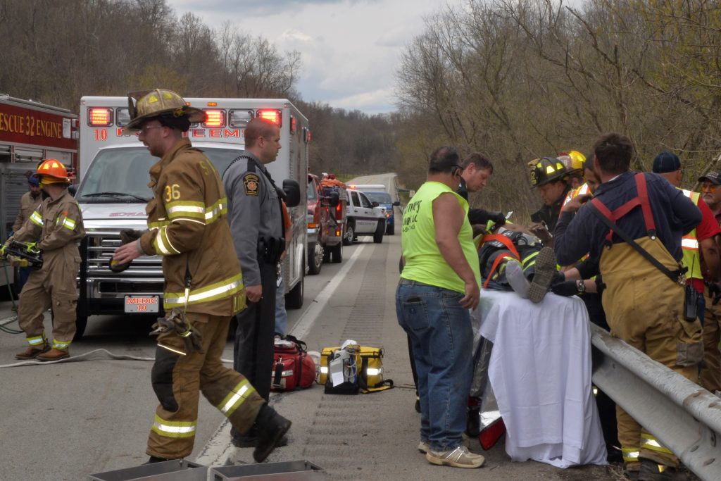Firefighters congratulate each other after freeing Marvin Mills, 61, of Vanderbilt from a wreck along Route 51 while Fayette EMS and STAT MedEvac prepare the driver for a medical helicopter flight to Pittsburgh.