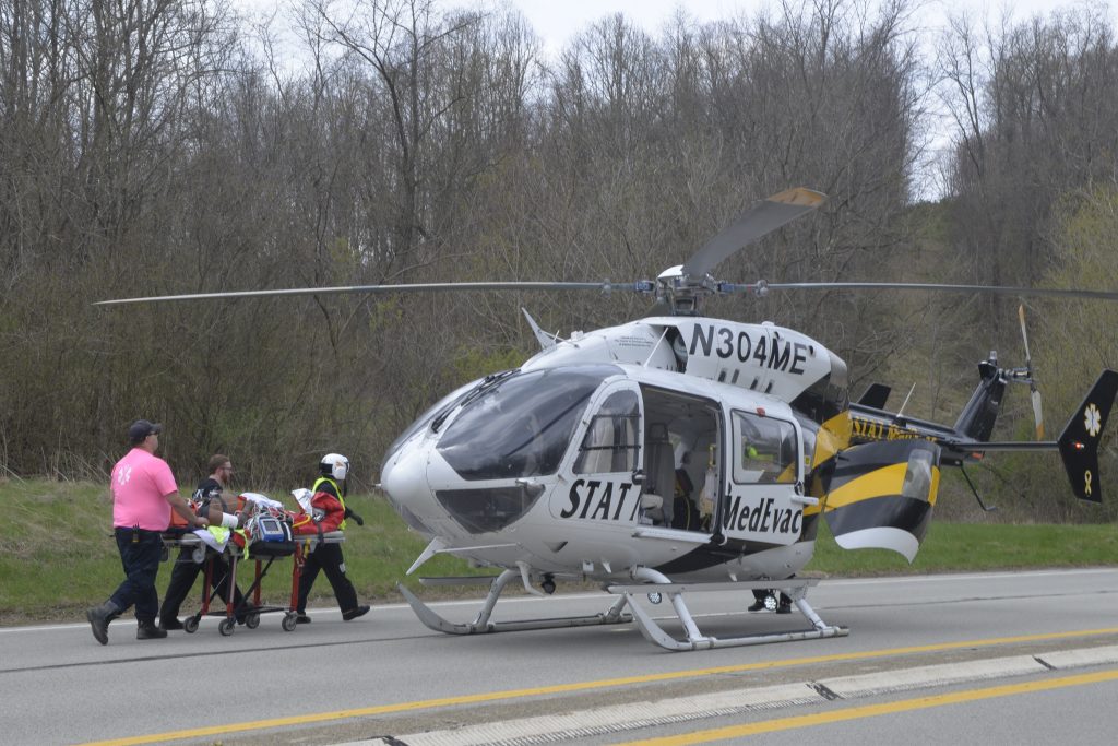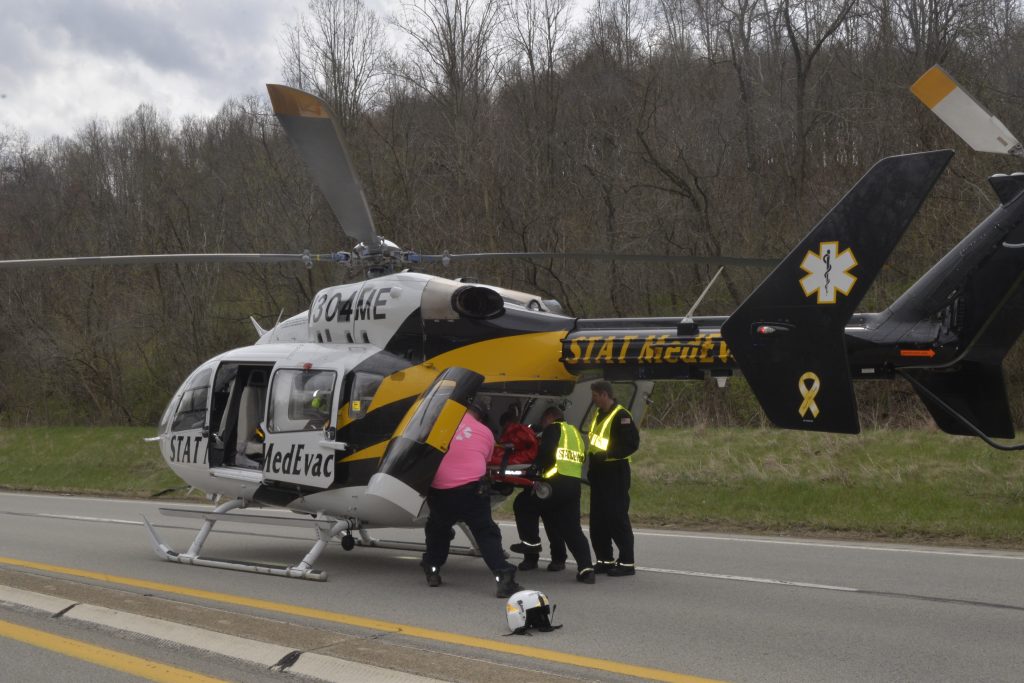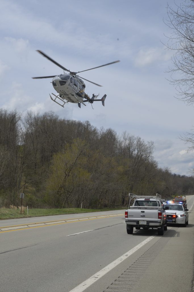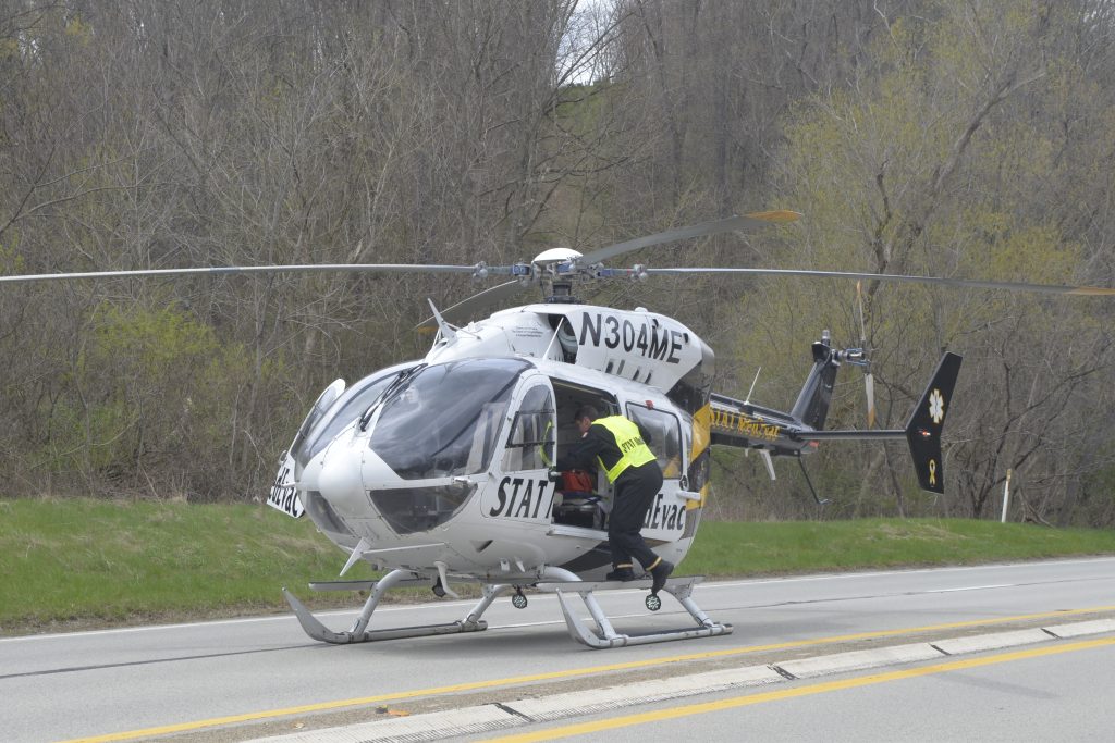 STAT MedEvac takes off from Route 51 carrying Marvin Mills, 61, to UPMC Presbyterian Hospital in Pittsburgh after he crashed along Route 51 in Franklin Township Friday afternoon.