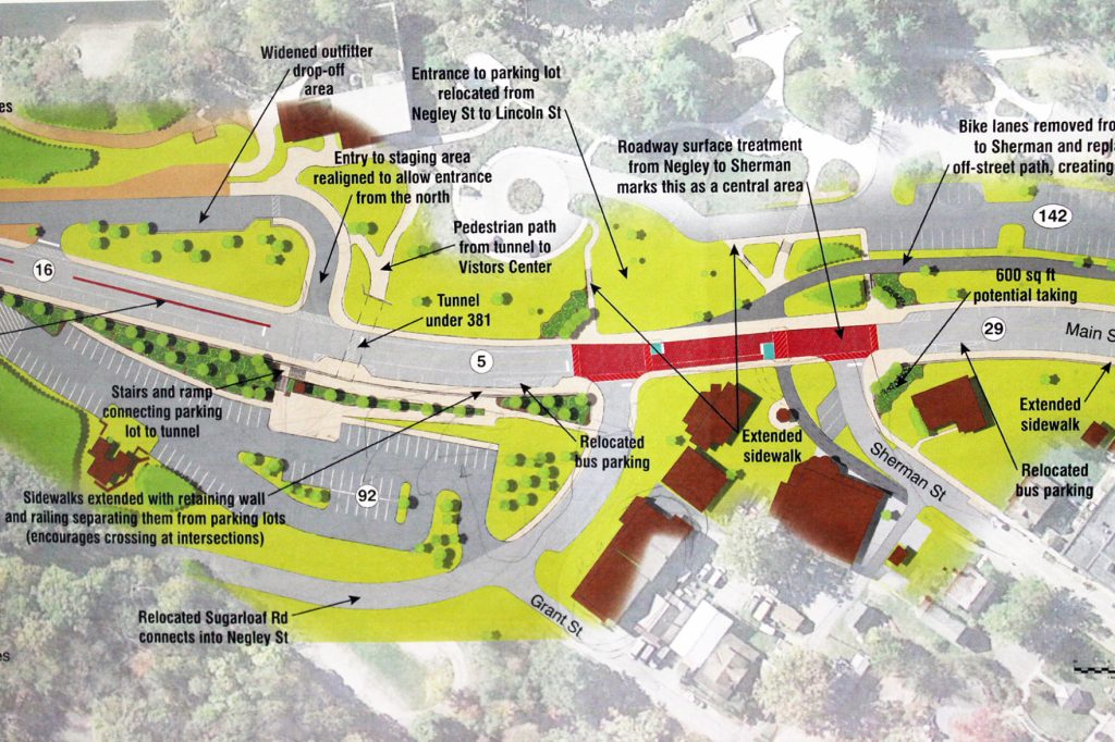 Options include adding curbs, sidewalks, specialized crosswalks and bicycle lanes, and relocating the end of Sugarloaf Road to the existing Negley Street. Szczur said one concept involves installing a tunnel — a pedestrian underpass — near the visitor center to allow people to walk safely under Route 381. The project, which comes with an $8 to $9 million price tag, has the highest safety rating of all of the options.