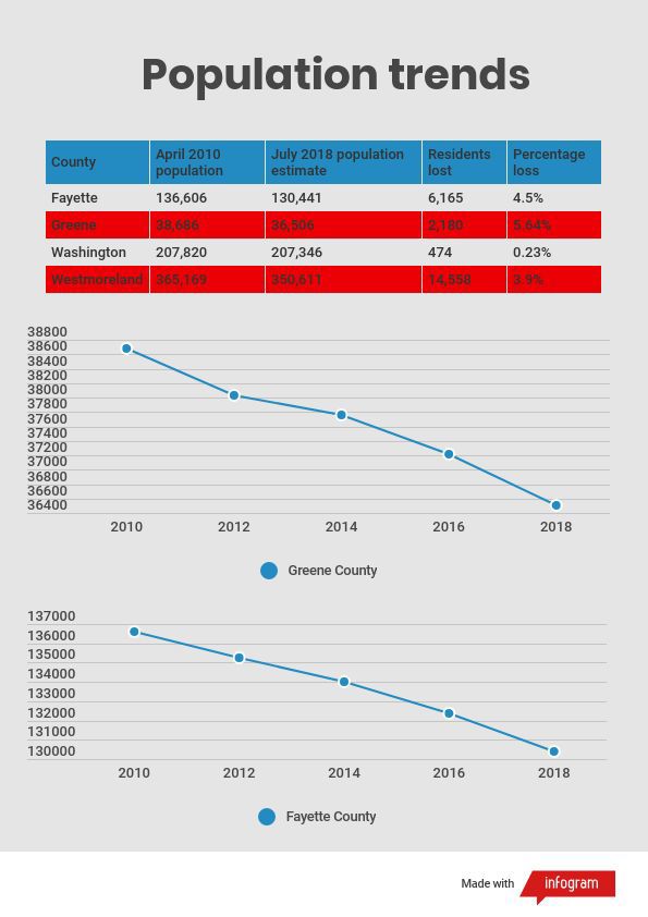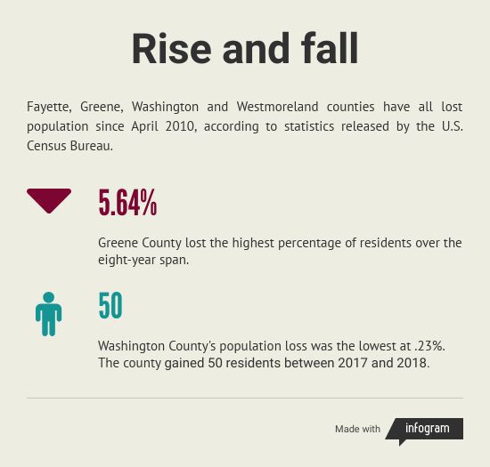 The 2018 population estimates, released last week, indicate a 684-resident drop in Fayette, 343-person drop in Greene and a 1,710 drop in Westmoreland. Washington, whose population dropped only 0.23% since the 2010 Census, gained 50 residents, according to the estimate.