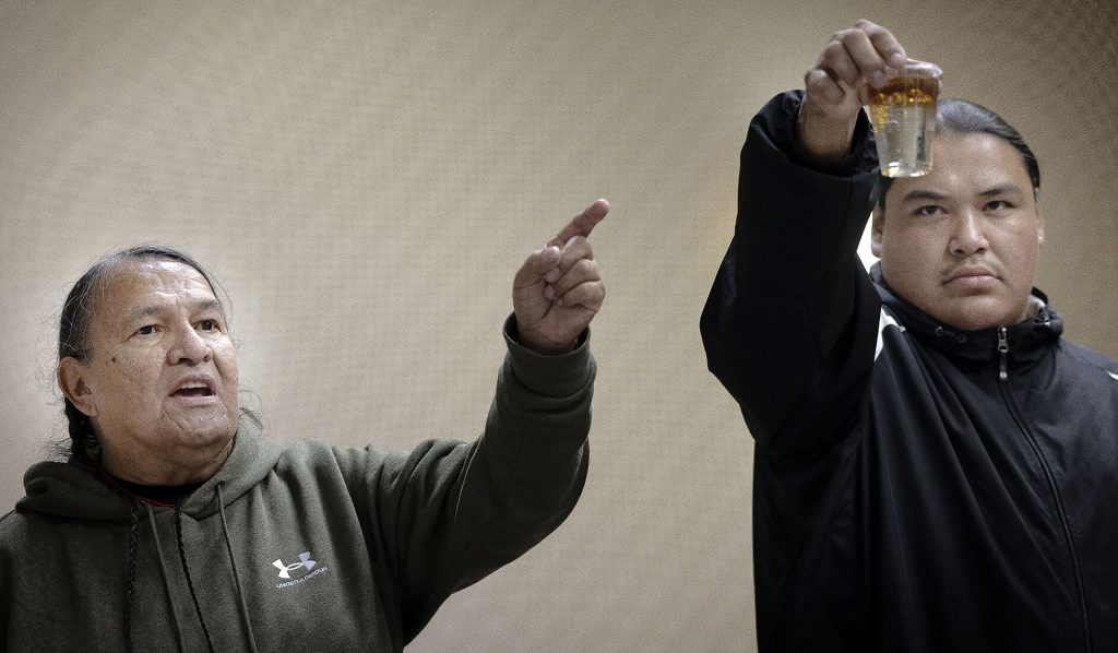 Joe Lafferty, a Native American activist who opposes the pipeline, poured oil and water into a cup and challenged Corps officials to take a drink.