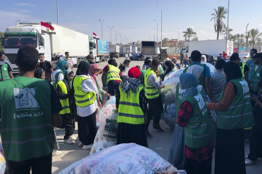 Humanitarian aid convoy for the Gaza Strip is parked in Arish, Egypt, Monday, Oct. 16, 2023. Hundreds of Palestinians in the Gaza Strip have fled their homes ahead of an expected Israeli ground invasion aimed at destroying Hamas after its fighters rampaged through southern Israel.