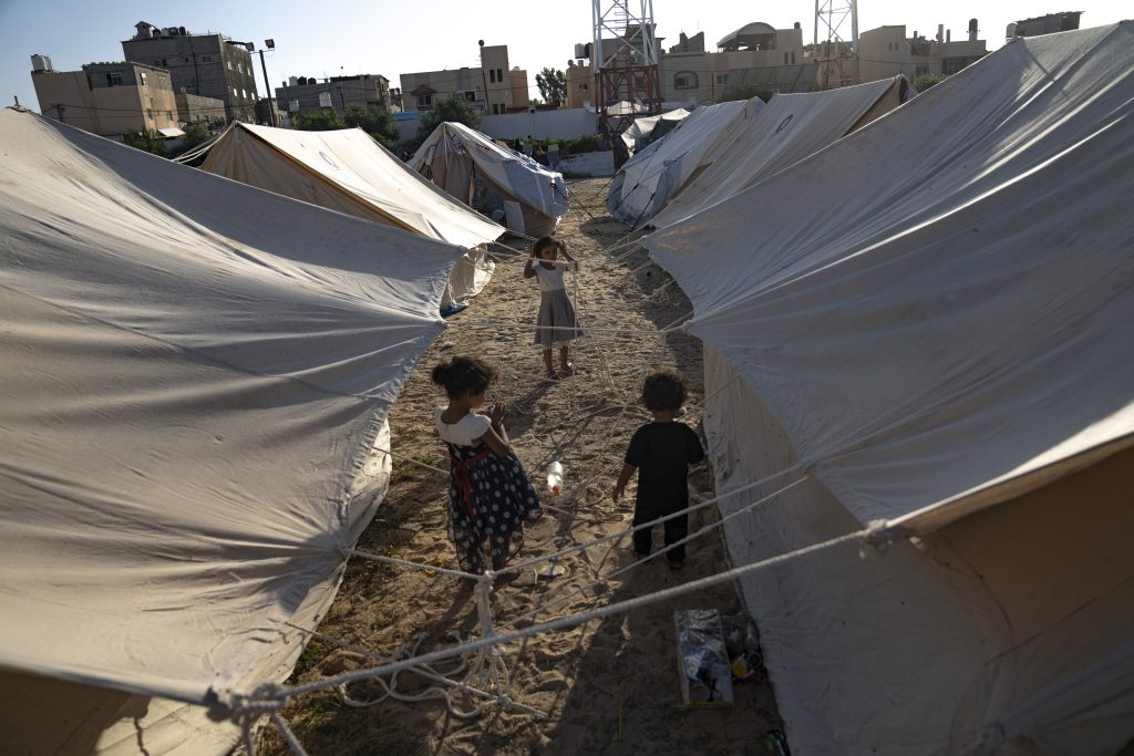 Palestinian children displaced by the Israeli bombardment of the Gaza Strip walk in a UNDP-provided tent camp in Khan Younis, on Thursday, Oct. 19, 2023. Since the Israeli military decided to cut off the Gaza Strip's water and fuel and prevent aid convoys from entering, Palestinians in Gaza have sheltered with their families far from their homes and struggled to survive. It's a grueling routine — waiting hours for bread, trying to find water, soothing children during bombings.