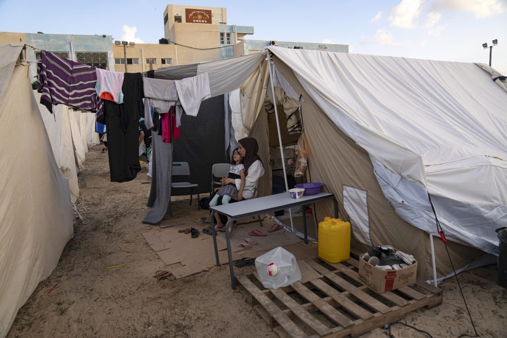 UNDP provided tens set up for Palestinians displaced by the Israeli bombardment of the Gaza Strip, are seen in Khan Younis, on Thursday, Oct. 19, 2023. Since the Israeli military decided to cut off the Gaza Strip's water and fuel and prevent aid convoys from entering, Palestinians in Gaza have sheltered with their families far from their homes and struggled to survive. It's a grueling routine — waiting hours for bread, trying to find water, soothing children during bombings.
