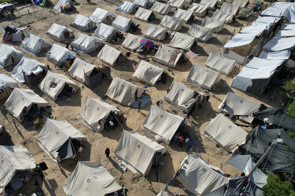 A UNDP-provided tent camp for Palestinians displaced by the Israeli bombardment of the Gaza Strip is seen in Khan Younis, on Thursday, Oct. 19, 2023. Since the Israeli military decided to cut off the Gaza Strip's water and fuel and prevent aid convoys from entering, Palestinians in Gaza have sheltered with their families far from their homes and struggled to survive. It's a grueling routine — waiting hours for bread, trying to find water, soothing children during bombings.