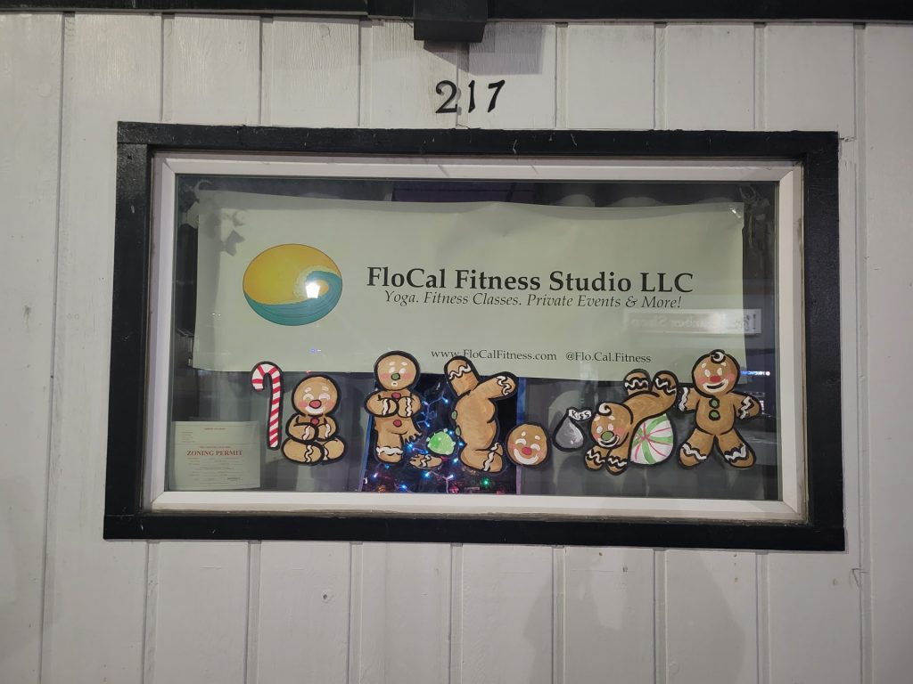 Gingerbread men and women strike yoga poses on the storefront window of the FloCal Fitness Studio. Christmas trees and wreaths grace the front of California Consignments. And Santa, a snowman and an elf jam out to music at Mrs. D’s Music Studio.