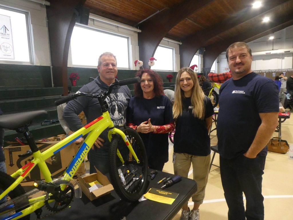 Volunteers from Washington Financial were on hand to build bikes. Group members included, from left, Tim Grady, Laura Austin, Georgia Kourakas, and Bill Harker.
