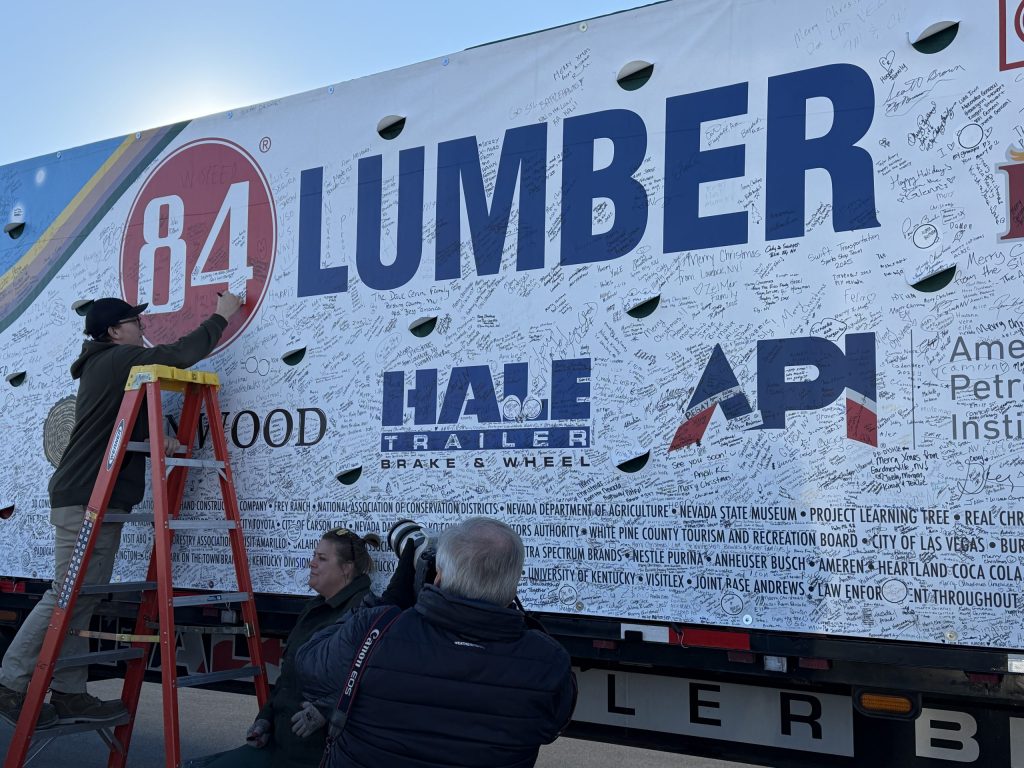 The tree arrived at 84 Lumber with a police escort. Those who came to see it were able to sign the side of the truck.