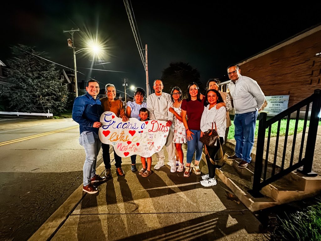 Jesus Teran, in a gray sweat suit, is surrounded by family and close friends on Monday night, after he was released earlier in the day from Moshannon Valley Processing Center, a private ICE detention facility in Clearfield County.