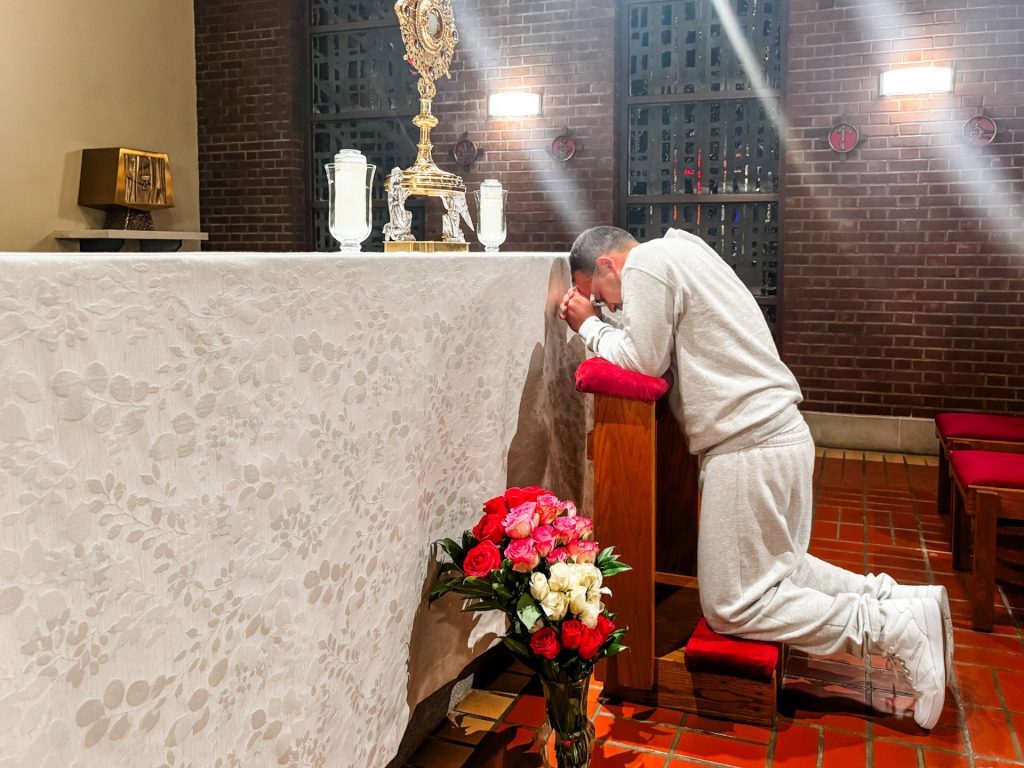 Jesus Teran prays in the chapel at St. Patrick Church on Monday, hours after he was released from Moshannon Valley Processing Center, an ICE facility where he had been detained for nearly three months.