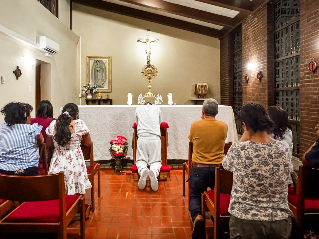 Jesus Teran, surrounded by his family and close friends, prays at the chapel at St. Patrick Church in Canonsburg on Monday, after his release from Moshannon Valley Processing Center in Philipsburg, Clearfield County.