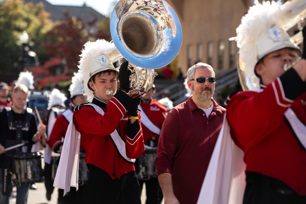 The PennWest California marching band performs at the Homecoming parade.
