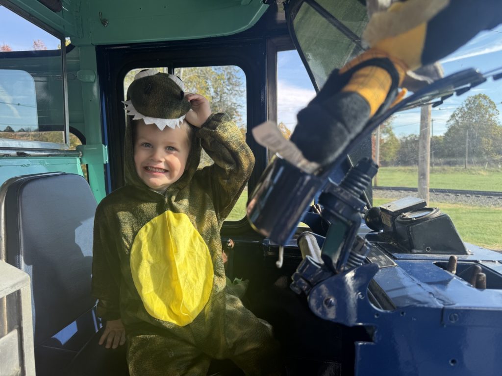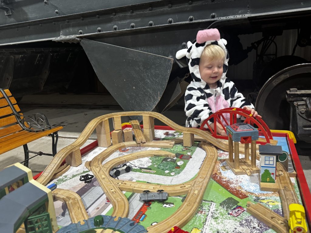 Eddie Miller, 2, of Washington, dressed as a cow, enjoys the train set at the Pennsylvania Trolley Museum on Saturday during the Trick or Trolley annual event.