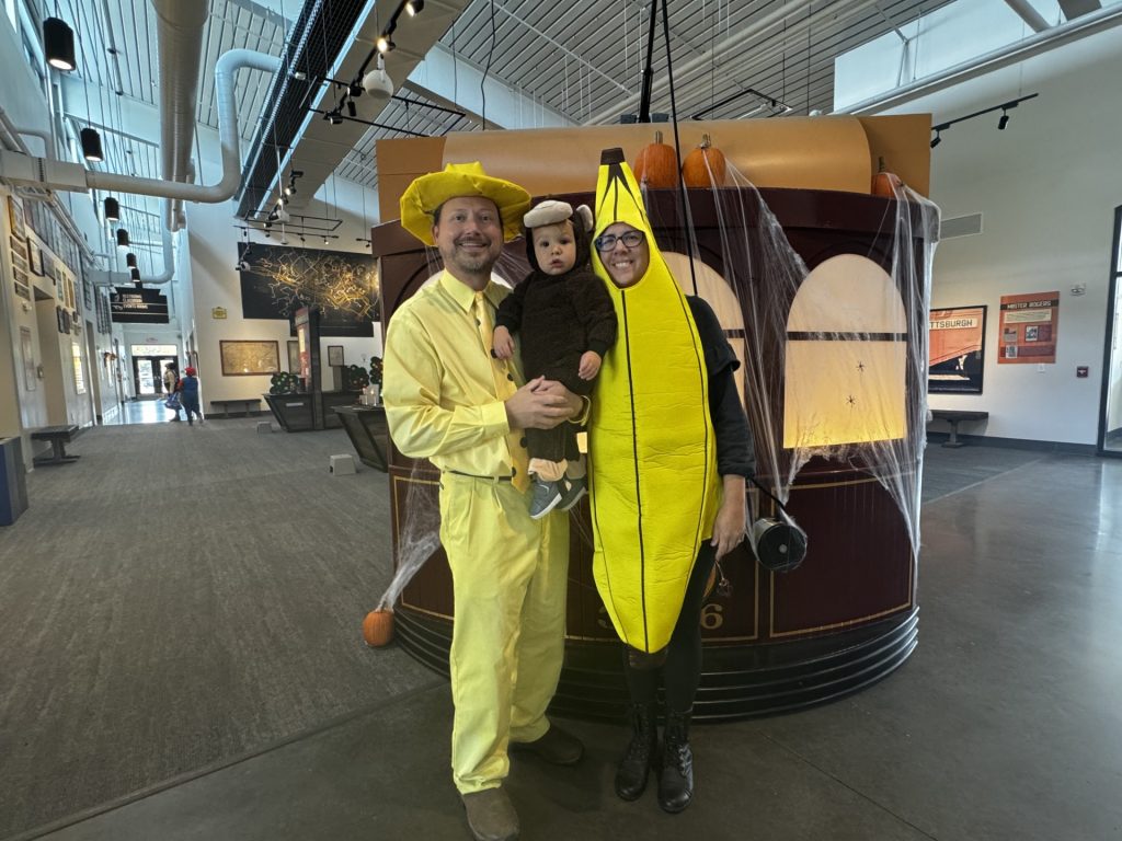 Matt and Alyssa Redfield of Pittsburgh, with their son, Jace, 18 months, dressed as Curious George characters when the family visited the Pennsylvania Trolley Museum for the Trick or Trolley event on Saturday.